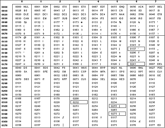 [XSI] [Option Start] The following two tables display the octal number character values used for the ascii and ebcdic conversions (first table) and for the ibm conversion (second table). In both tables, the ASCII values are the row and column headers and the EBCDIC values are found at their intersections. For example, ASCII 0012 (LF) is the second row, third column, yielding 0045 in EBCDIC. The inverted tables (for EBCDIC to ASCII conversion) are not shown, but are in one-to-one correspondence with these tables. The differences between the two tables are highlighted by small boxes drawn around five entries. [Option End]